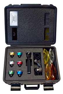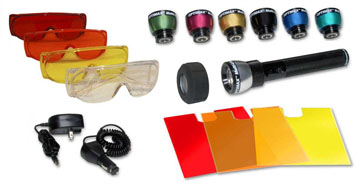 多波段警用檢查光源配有結實的黑色陽化鋁手電殼體、七個可快速更換的LED燈頭(UV-A(長波紫外)、藍光、藍綠光、綠光、琥珀光及白光)、三個插入式濾色板(黃色、橙色及紅色)、交流及直流充電器、四個眼鏡(紫外防護、橙色、黃色及紅色眼鏡)及一個手提箱。