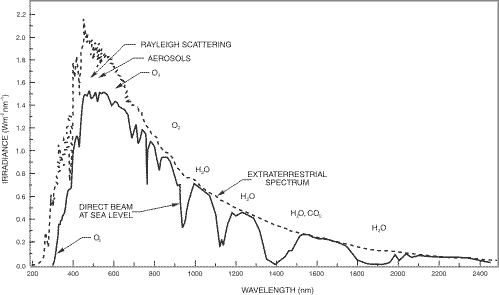 ● 不同類(lèi)型光源的光譜輻射度曲線 ![]() ![]() ◆ 輸出總功率 ![]() 據(jù)相關(guān)標(biāo)準(zhǔn)規(guī)定,約1000W/m2(@AM