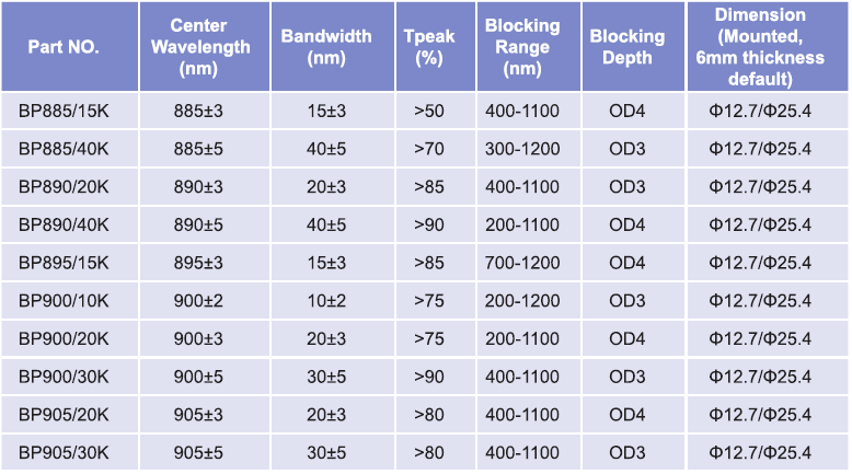 帶通濾光片波長(zhǎng)范圍:885nm-905nm
