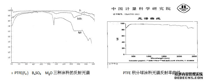 這是一種常用的積分球,用于測(cè)量各種樣品的反射率,透射率,在球體上前后兩半球相對(duì)位置上開有入光孔,樣品孔,在球體上適當(dāng)位置裝有接收器,并在接收親器與樣品孔之間設(shè)以擋板,以防樣品的一次反射光進(jìn)入接收器。這種球的尺寸為 φ30-2500mm ,一般配有支架和底座。內(nèi)表面噴涂?jī)?yōu)質(zhì)的PTFE涂料,反射率高,壽命長(zhǎng),表面整體性好。PTFE涂料的光譜曲線見圖示。