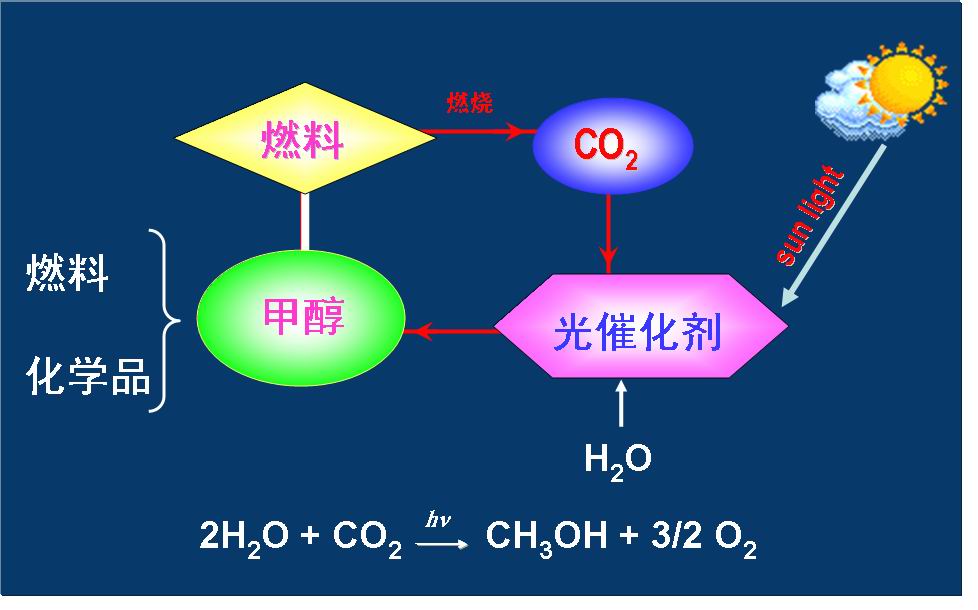 其二是原位條件下將上述兩個反應在一個催化體系中實現(xiàn)。即,利用太陽能光催化直接將CO2+H2O轉(zhuǎn)化為CH3OH。此過程的關(guān)鍵科學問題是:(1)發(fā)展兼具有分解水制氫和CO2加氫的光催化劑;(2)將生成的氧能及時脫附離開催化劑的表面,避免氧化逆反應地發(fā)生。