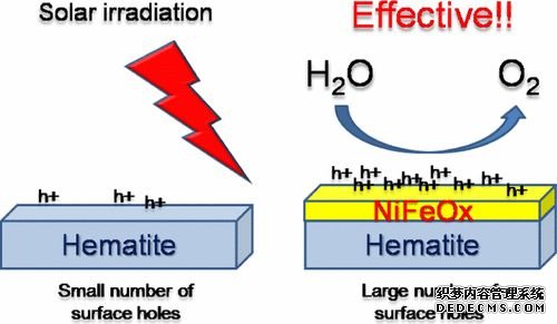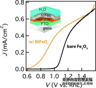 但目前在Fe2O3上降低開啟電勢有效的催化劑為NiFeOx。關(guān)于Fe2O3的開啟電勢差,Dunwei Wang課題組認(rèn)為是由于Fe2O3大量的表面態(tài)導(dǎo)致費(fèi)米能級釘扎,通過NiFeOx助催化劑的引入,大程度降低了表面費(fèi)米能級的釘扎效應(yīng),因此獲得了較好的開啟電勢。(上圖,DOI:10.1002/anie.201306263)