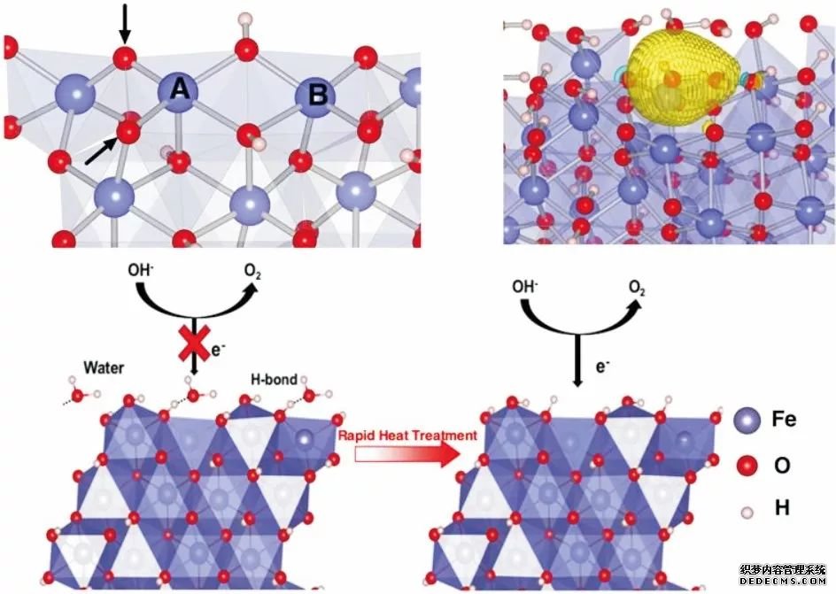 羅文俊課題組發(fā)現(xiàn)通過高溫短時間煅燒除去α-FeOOH 表面吸附水的方法,可以提高α-FeOOH 的產(chǎn)氧活性和穩(wěn)定性,通過理論計算發(fā)現(xiàn),表面吸附水會與FeOOH 表面的O形成強(qiáng)的氫鍵,影響活性位點(diǎn)對OH- 的吸附和氧化,從而影響了其產(chǎn)氧的活性。 (DOI:10.1039/C6TA08719A)