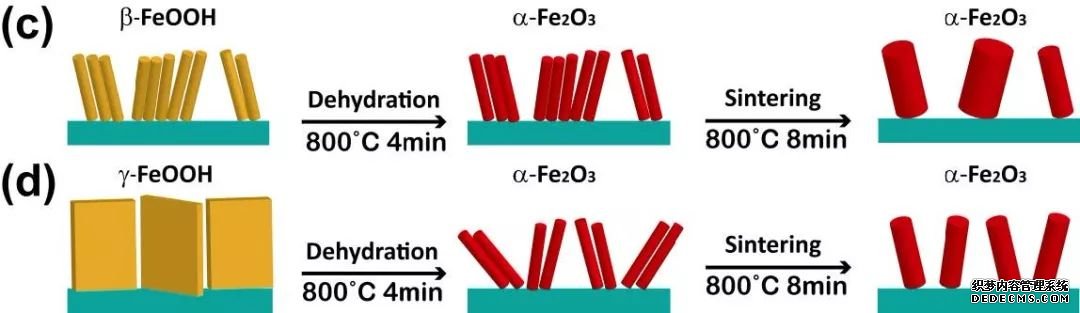 Yilin Liu等發(fā)現(xiàn) FeOOH的晶相結(jié)構(gòu)會對煅燒過程有影響:當(dāng)FeOOH 為緊密堆積的β相時,煅燒過程中納米棒會燒結(jié),終得到的Fe2O3納米棒會比較粗(約65nm);而當(dāng)FeOOH為層狀結(jié)構(gòu)的γ相時,煅燒過程中結(jié)構(gòu)會脫水?dāng)嗔,能生成超?xì)結(jié)構(gòu)的納米棒(約20 nm) ,其光電流相比于直徑較粗的Fe2O3,也有了1.5 倍的提升。(上圖,DOI:10.1088/1361-6463/aa6fb7)