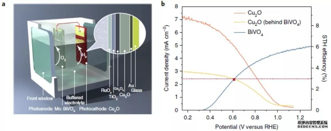 圖1 p-n 疊層光電化學(xué)水分解電池示意圖(a) 和性能曲線(b)