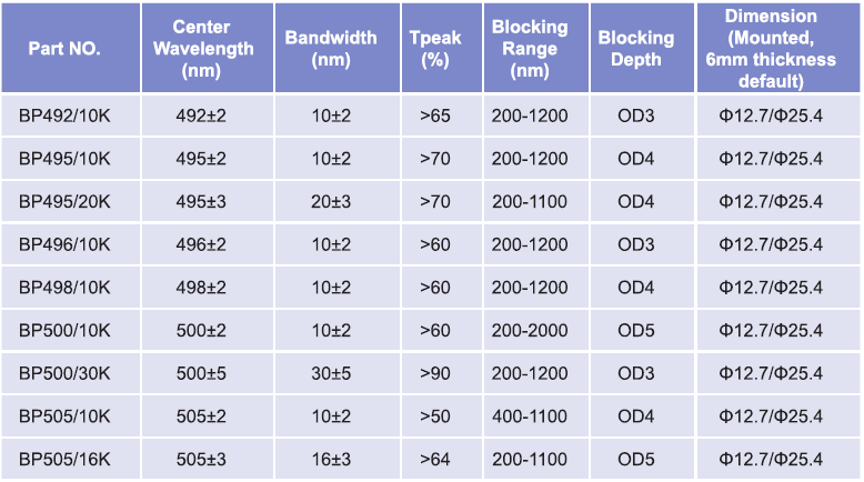 帶通濾光片波長(zhǎng)范圍:492nm-505nm