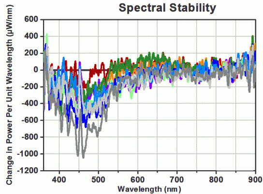 這些曲線是把光源啟動后不同時(shí)間的光譜減去一個(gè)起始參考光譜的結(jié)果。不同顏色是不同的時(shí)間的光譜數(shù)據(jù)(0.2h-24h))