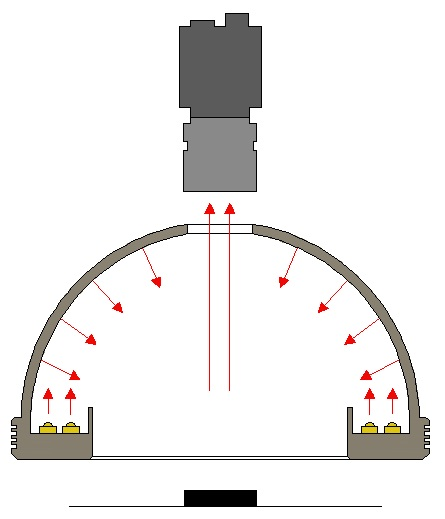 光源從底部發(fā)光,經過多次漫反射形成無影光源,DOME光源是一種高均勻性的光源,適用于表面凹凸不平、反光物體檢測。