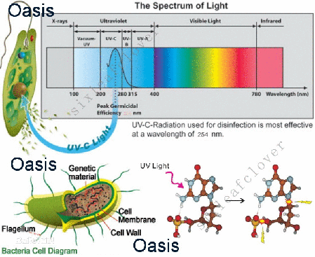 波長(zhǎng)在240~280nm范圍內(nèi)的紫外線(xiàn)可以破壞細(xì)菌病毒DNA(脫氧核糖核酸)或RNA(核糖核酸)的分子結(jié)構(gòu),造成生長(zhǎng)性細(xì)胞死亡和(或)再生性細(xì)胞死亡,達(dá)到滅菌消毒的效果。尤其是波長(zhǎng)為254nm的紫外線(xiàn),滅菌消毒的效果強(qiáng)且不會(huì)產(chǎn)生臭氧造成二次污染。有待于進(jìn)一步發(fā)展和研究。
